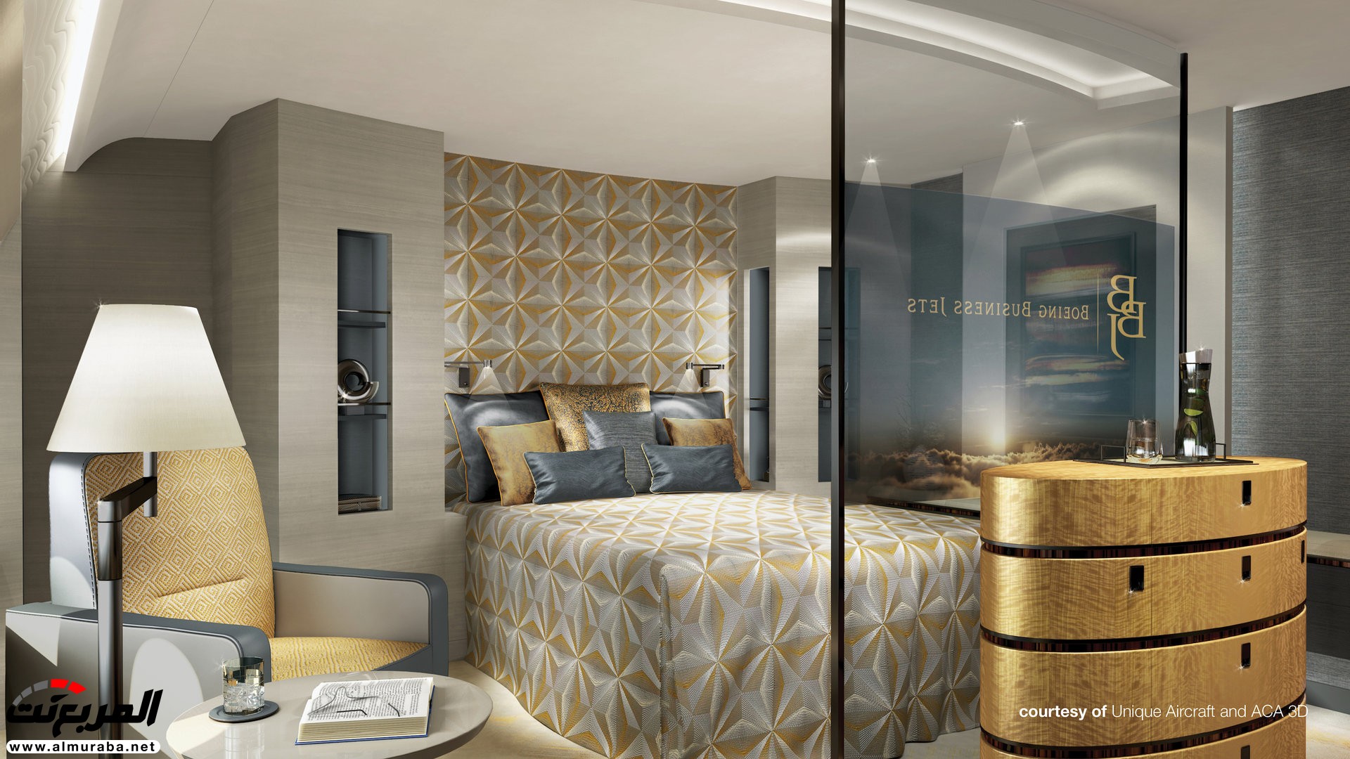 استعرضت بوينج عدة تصميمات نموذجية للداخلية، وهو ما يبدأ مع شركة Jet Aviation، حيث تتضمن مدخل عصري، متبوعاً باستراحة ضخمة بالقرب من غرفة طعام فاخرة.