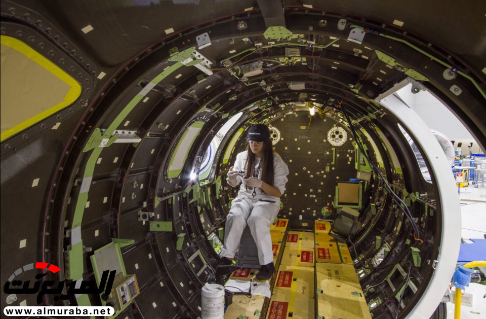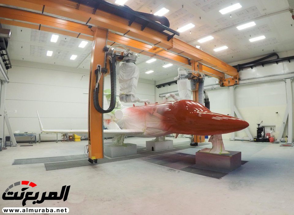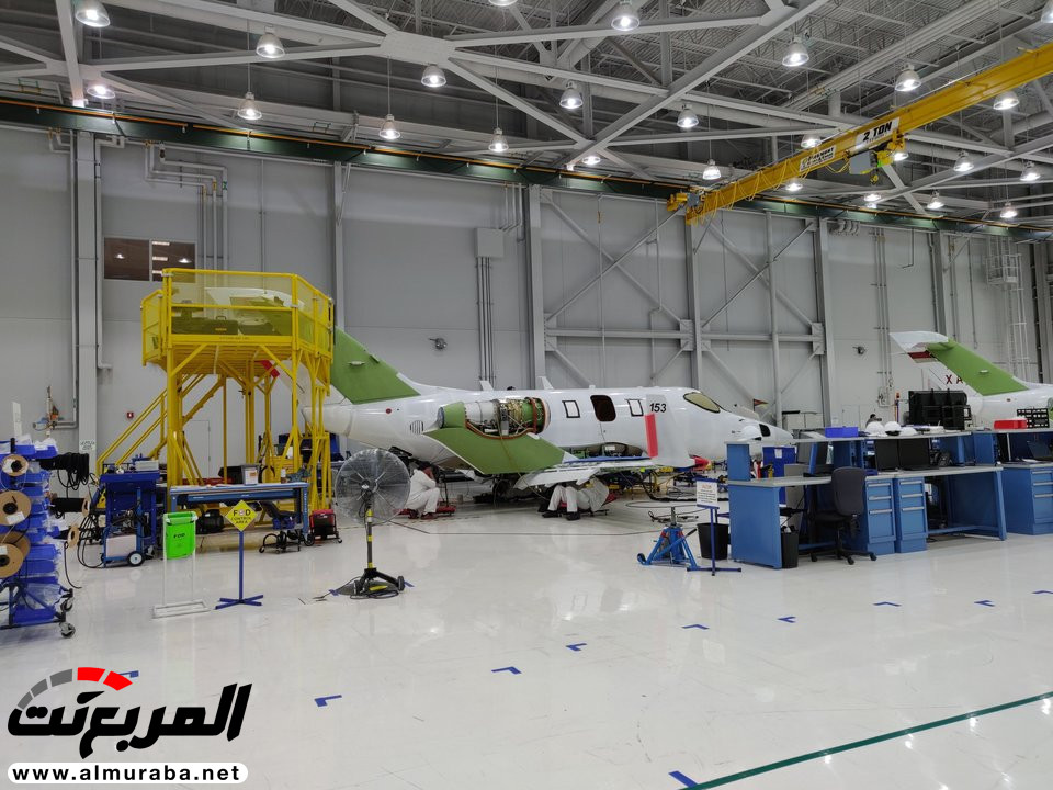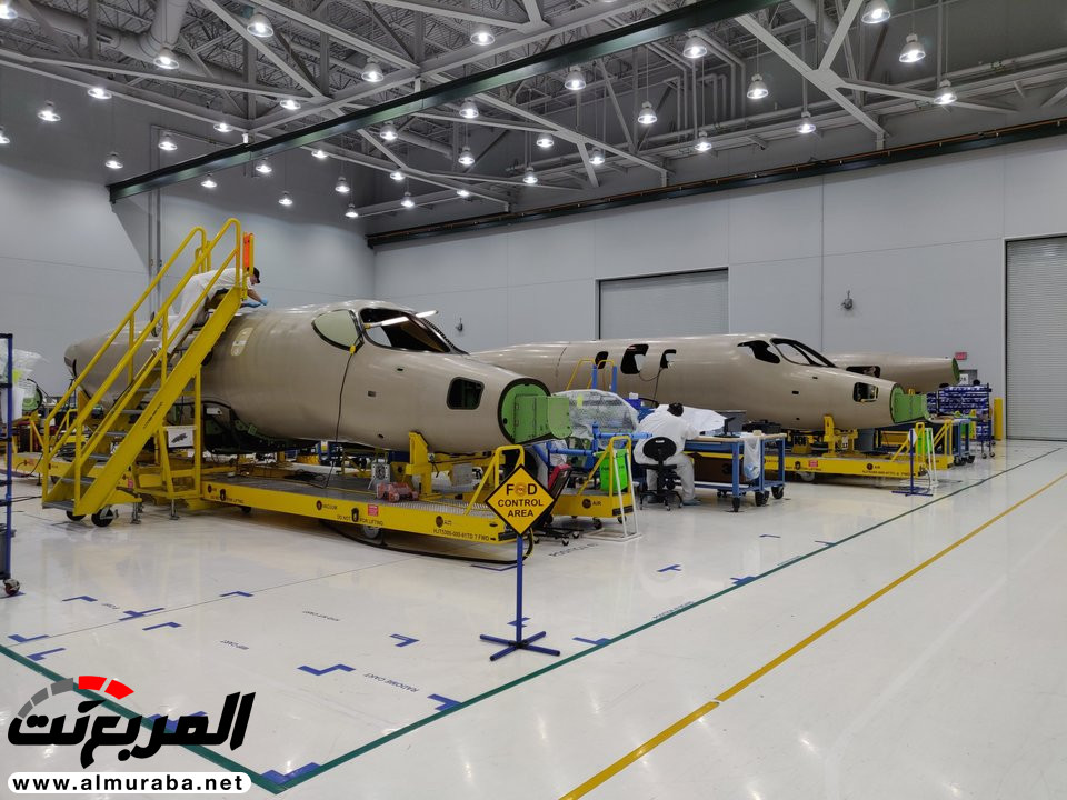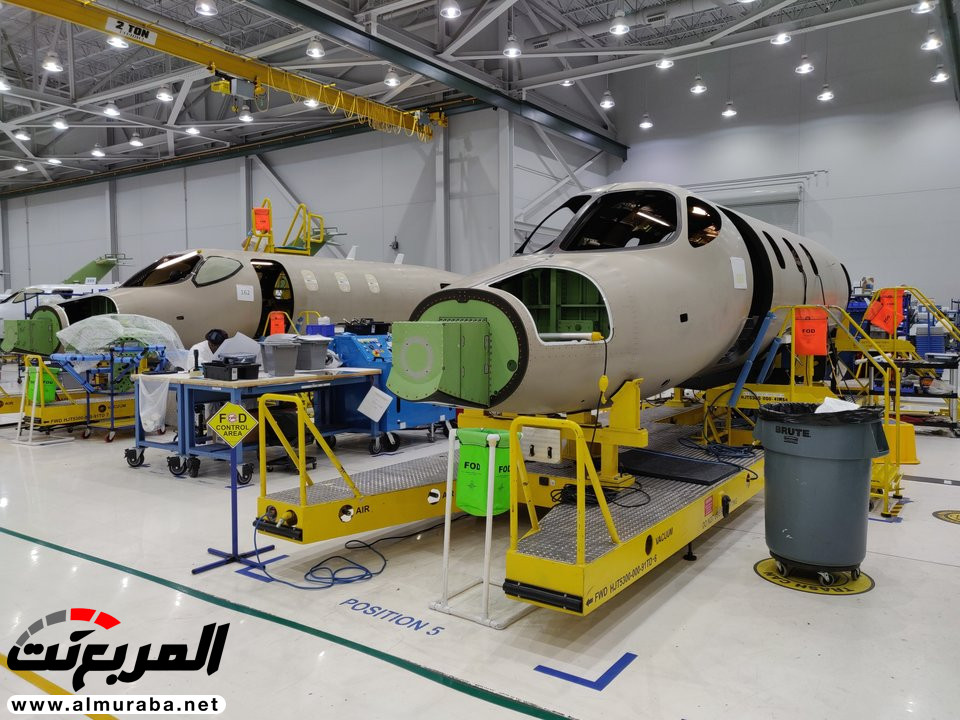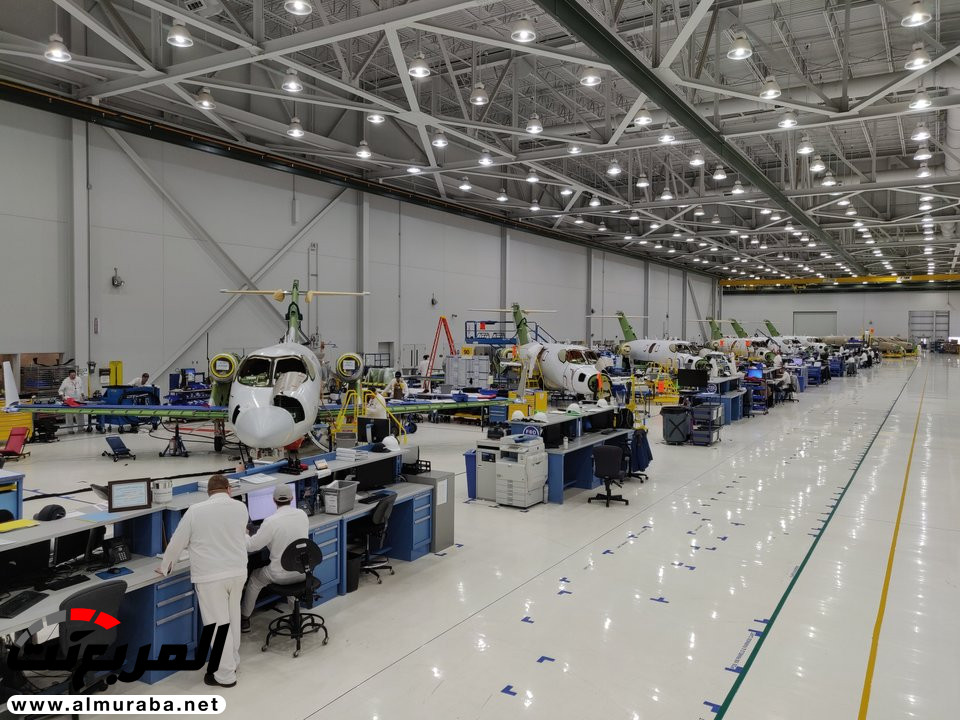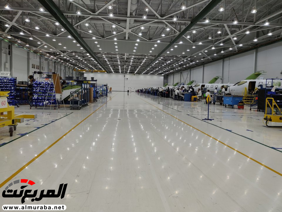 داخل منشأة الإنتاج نرى عدة طائرات مصطفة في مراحل مختلفة من عملية التجميع اليدوية، بينما نرى طائرة شبه مكتملة في نهاية خط الإنتاج.