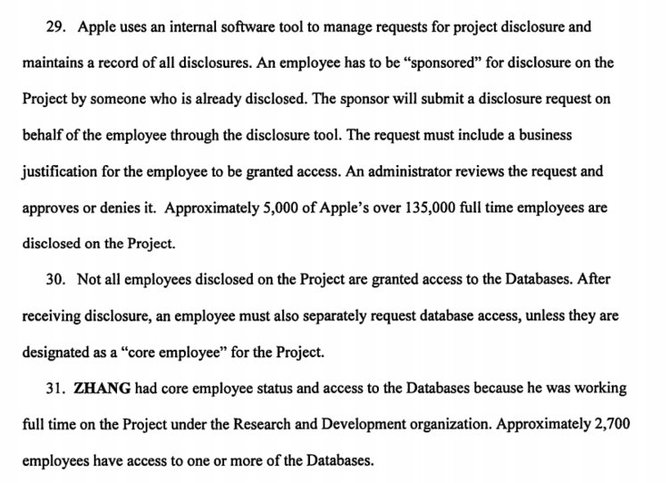 حسب الشكوى، أعلمت آبل 5,000 موظف من أصل 135,000 بمشروع القيادة الذاتية الخاص بها، وهو ما يتناقض مع التسريبات السابقة التي أفادت بعلم وعمل 1,000 موظف فقط بالمشروع.