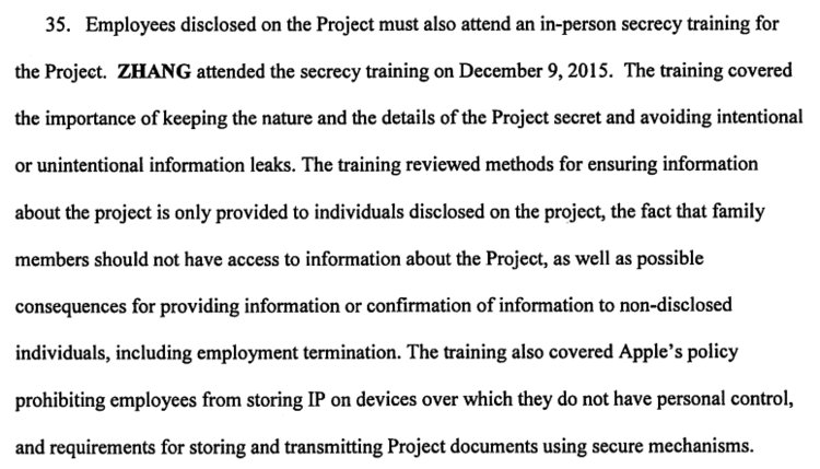 كما احتوت الشكوى المقدمة من مكتب التحقيقات تفاصيل بروتوكولات آبل الداخلية ﻹعلام الموظفين بالمشاريع السرية، وهو ما يحدث عبر أن يقوم أحد المديرين الذين يثق بهم تيك كوك المدير التنفيذي، برعاية أحد الموظفين من أجل اطلاعهم على المشروع.