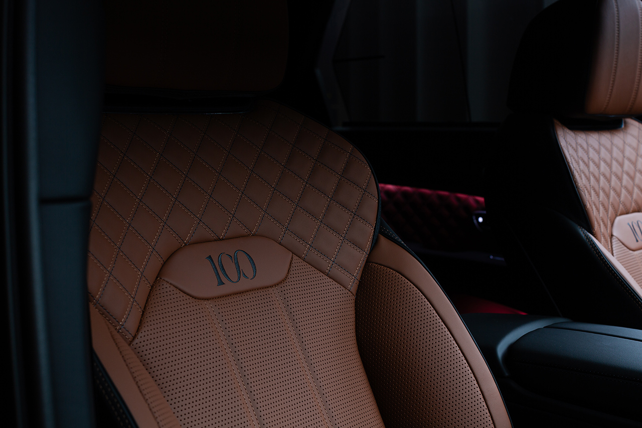 تستمر اللمسات الحصرية في داخلية طرازات بنتلي للذكرى المئوية لوكيل زيورخ، والتي حصلت على جلد فاخر باللون البني مع خطوط خياطة بمظهر ماسي من اللون الأزرق المشابه لطلاء السيارة الخارجي، بالإضافة إلى تطريز شعارات 100 عام على مساند رأس المقاعد.