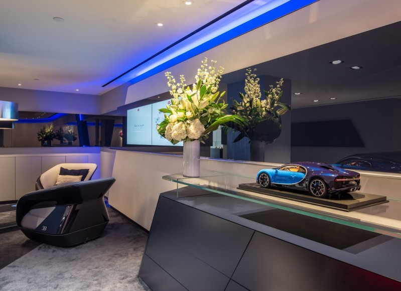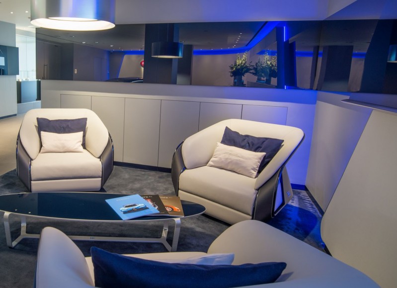 سيمكن للعملاء تفحص سياراتهم أثناء الجلوس على المقاعد المصنوعة خصيصا بألياف كربونية زرقاء ومحاطة بلمسات زرقاء مميزة للشركة في الأثاث والإضاءة.
