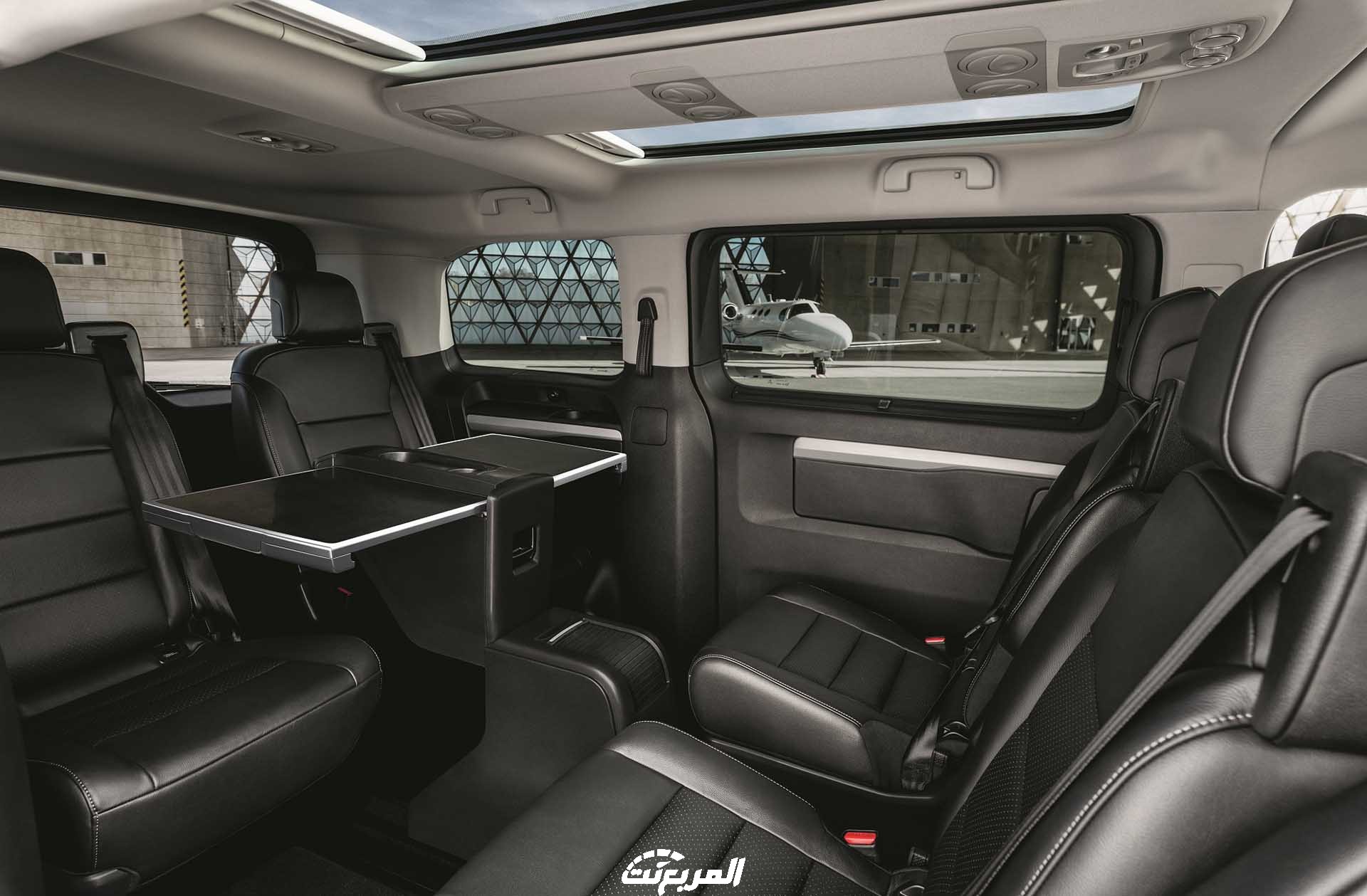تتميز بيجو ترافلر بمقصورة واسعة، يمكن تغيير إعدادات المقاعد لتصبح متقابلة، هذا بالإضافة إلى لوحات الزجاج المنفصلة في سقف السيارة والتي تعطي الركاب إضاءة فريدة ورؤية بانورامية للسماء، كما أن النوافذ الملونة تسمح للركاب بالحفاظ على خصوصيتهم.