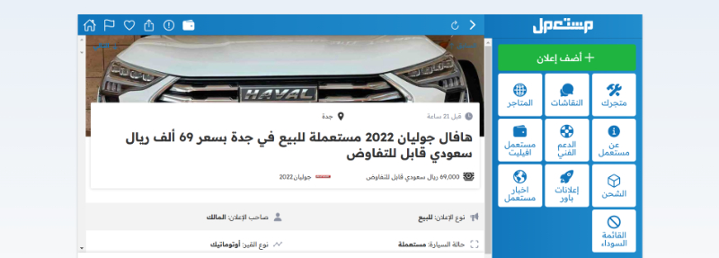 قام أحد المعلنين بوضع سيارته للبيع على تطبيق مستعمل، وهي سيارة هافال جوليان موديل 2022 بحالة مستعملة وبسعر 69 ألف ريال سعودي مع الإشارة إلى قابلية التفاوض حول السعر، ويتضح في تفاصيل الإعلان أن السيارة مع ضمان الوكيل لمدة 5 سنوات أو 150 ألف كيلو ويرُجى العلم في هذا الجانب أن الإعلان بخصوص الضمان يأتي من المُعلن وليس من تطبيق مستعمل ويُمكن الوصول إلى الإعلان بالضغط هنا، وفي هذا الصدد يعرض لكم موقع «المربع نت» المواصفات الخاصة بالسيارة.