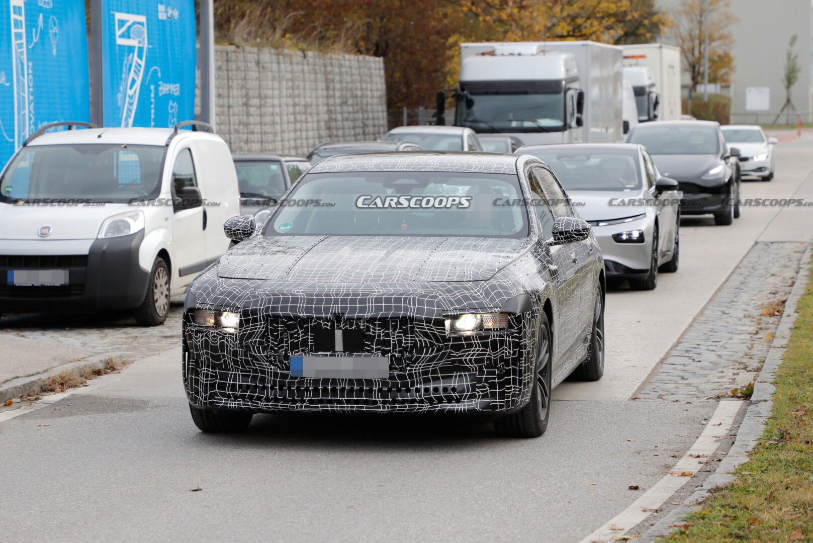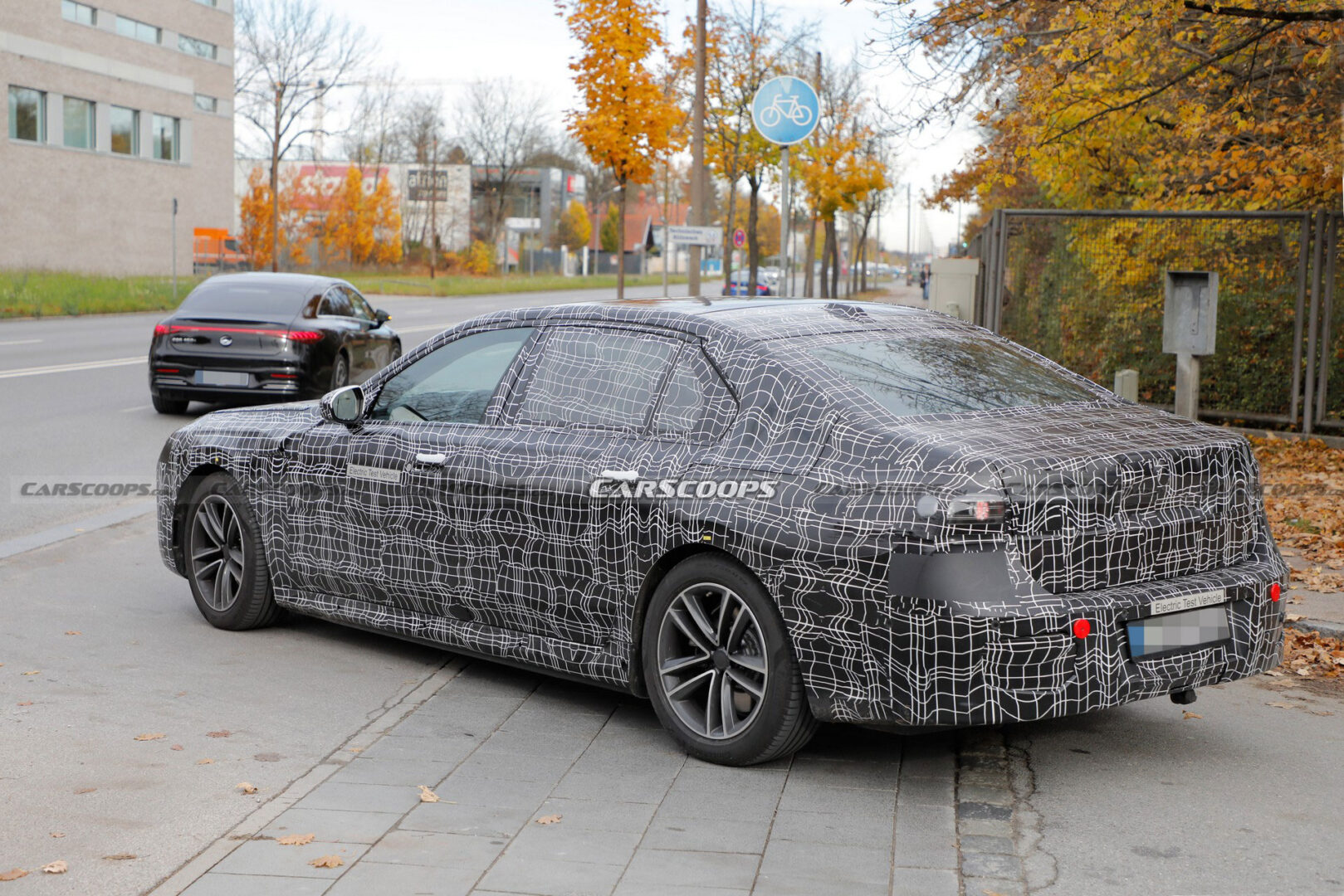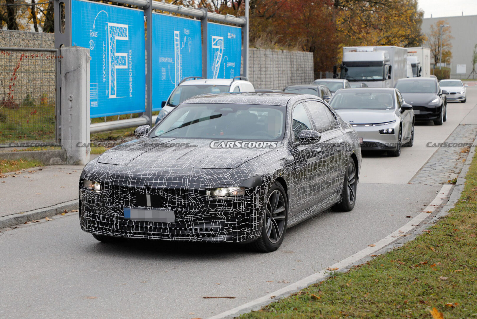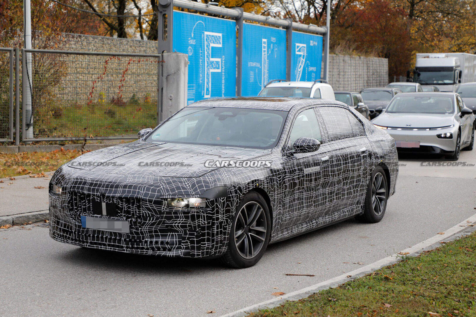 نرى في الصور المرفقة مرسيدس EQS الجديدة ولا مفاجأة هنا لكونها المنافسة الرئيسية لبي إم دبليو i7، كما نرى تيسلا موديل Y وإكس بنغ بي 7 كذلك خارج المركز التقني لبي إم دبليو في ميونخ.