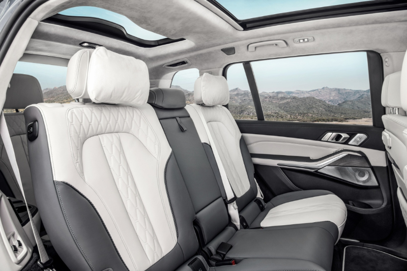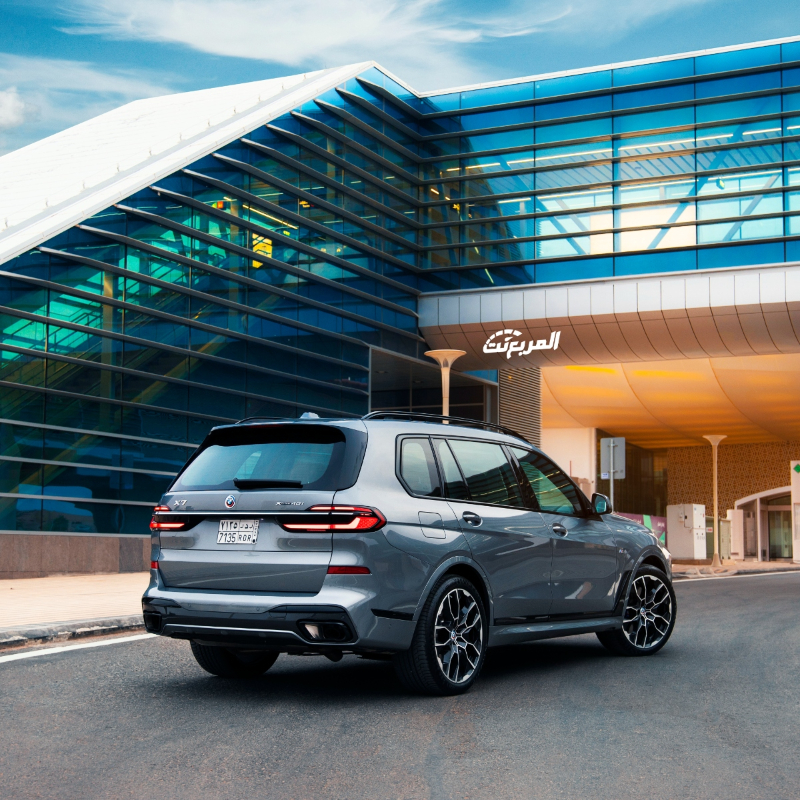 ترتكز السيارة على عجلات بمقاس 23 بوصة، وبالانتقال للجهة الخلفية فالمصابيح بتصميم ثلاثي الأبعاد مع شريط كرومي، ومن الأشياء التي تتزود أيضاً بها بي ام دبليو x7 وجود فتحة سقف البانورامية ” Sky Lounge”، والتي تسمح بدخول الضوء حسب رغبة الأشخاص المُتواجدين في المقصورة الداخلية.
