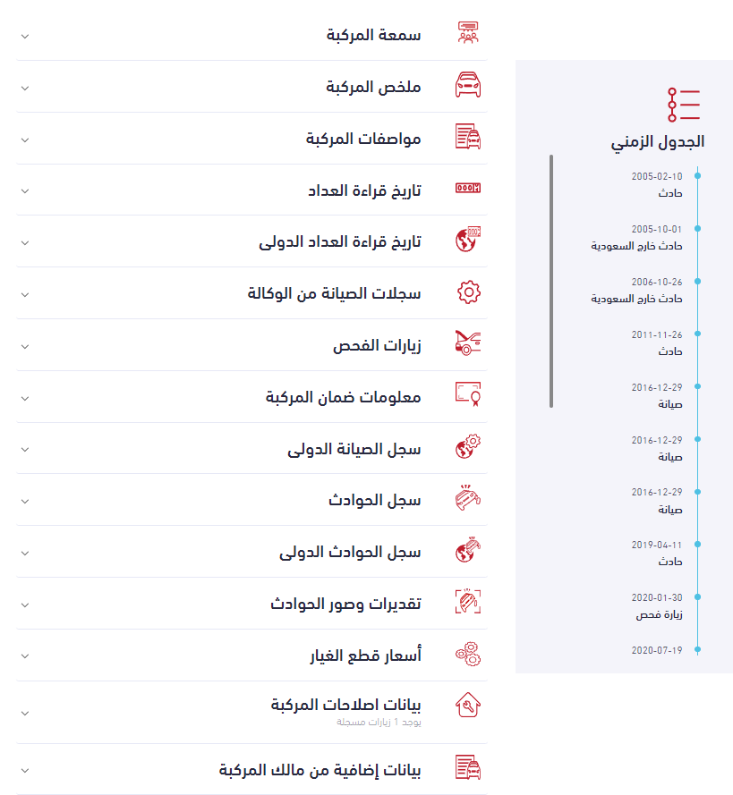 - بيانات الصيانة و والفحص الدوري وإصلاحات السيارة.
