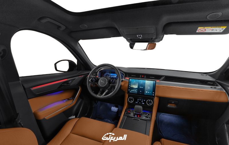 ولتوفير إحساس الفخامة داخل المقصورة، تأتي المقصورة بمواد فاخرة تشمل سقف داخلي أسود مورزين، وعتبات أبواب معدنية مضيئة بكتابة جاكوار، بالإضافة إلى تطعيم ألومنيوم داخلي، وسجاد أرضيات فاخر، وإضاءة داخلية اختيارية بـ 10 ألوان، مع ناقل حركة جديد بلون الكروم.