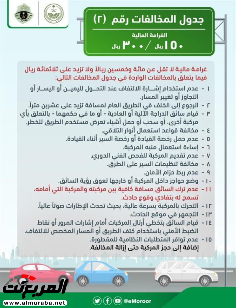 - غرامة تتراوح ما بين “150 – 300” ريال حال قيام السائق بتخطي عدة مركبات أمام إشارات المرور أو نقاط الضبط الأمني باستخدام كتف الطريق أو المسار المخصص للالتفاف.