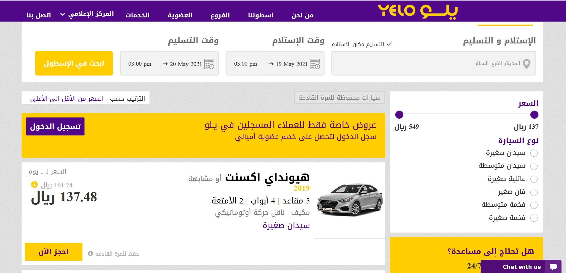 - يمكنك حجز سيارتك من خلال موقع يلو، فقط قم بالدخول إلى الموقع وتسجيل الدخول.