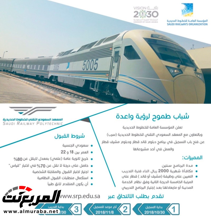 المربع نت – أعلنت المؤسسة العامة للخطوط الحديدية بالتعاون مع المعهد السعودي التقني “سرب” عن فتح باب التسجيل للشباب الراغبين في الحصول على دبلوم قائد قطار أو دبلوم مشرف قطار المنتهي بالتوظيف، كما أوضحت أن شروط القبول للتدريب في المعهد كالتالي: