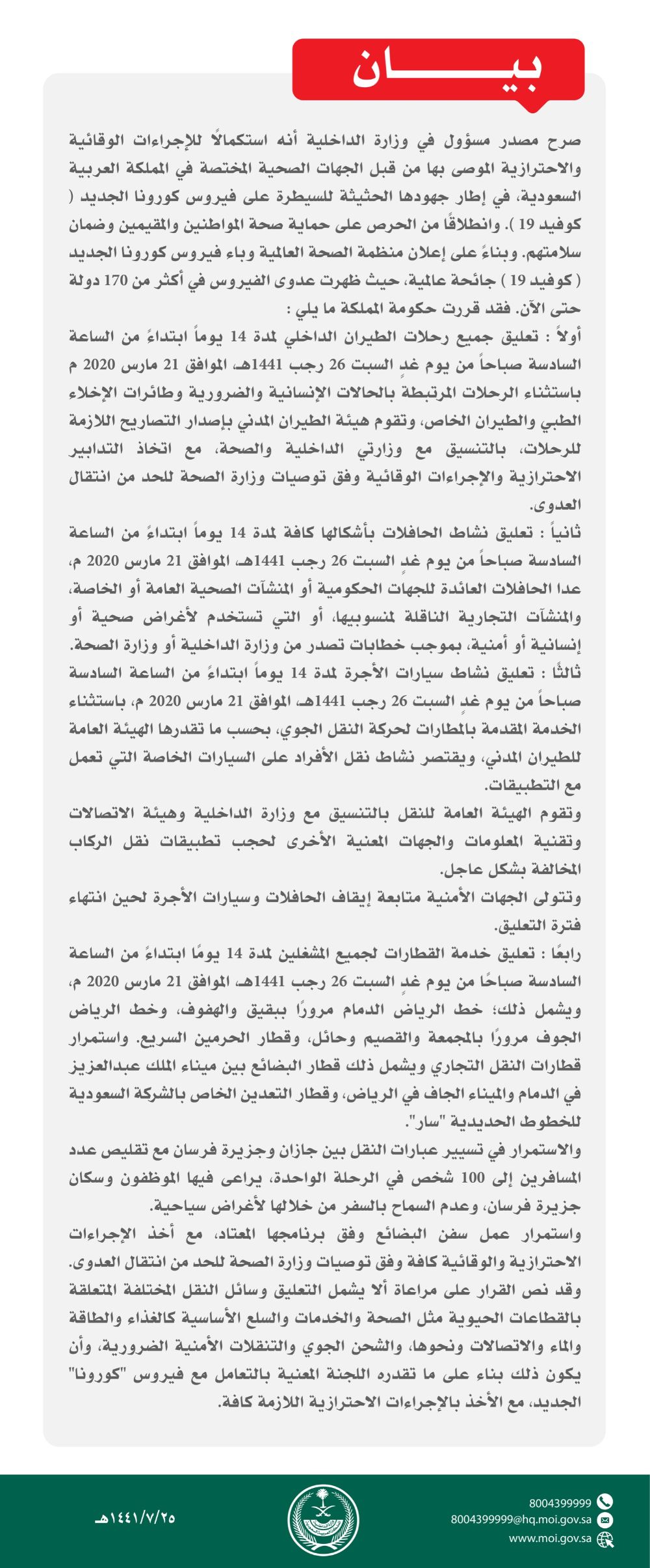 4- تعليق خدمة القطارات لجميع المشغلين لمدة 14 يوماً ابتداءاً من الساعة السادسة صباحاً من يوم الغد، ويشمل ذلك؛ خط الرياض الدمام مروراً ببقيق والهفوف، وخط الرياض الجوف مروراً بالمجمعة والقصيم وحائل، وقطار الحرمين السريع، واستمرار قطارات النقل التجاري ويشمل ذلك قطار البضائع بين ميناء الملك عبدالعزيز في الدمام والميناء الجاف في الرياض، وقطار التعدين الخاص بالشركة السعودية للخطوط الحديدية “سار”.