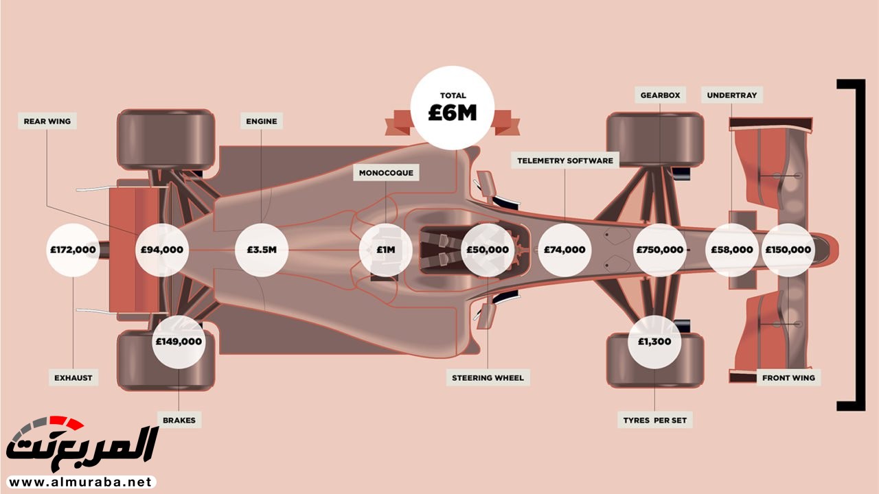 سيارات فورمولا 1 ذاتها باهظة الثمن، حيث تحتاج السيارة لمواد تصنيع تصل إلى 1.8 مليون جنيه استرليني (9.5 مليون ريال) – بدون المحرك، حيث يكلف الشاسيه حوالي مليون جنيه استرليني (5.24 مليون ريال) وأرضية السيارة تكلف 300,000 جنيه (1.57 مليون ريال)، وخوذة السائق وحده تكلف 26,000 ريال.. ويمكنكم الاطلاع على هذه المقالة والفيديو بداخلها لمعرفة المزيد من التفاصيل عن التكلفة الجنونية لقطع سيارات فورمولا 1.