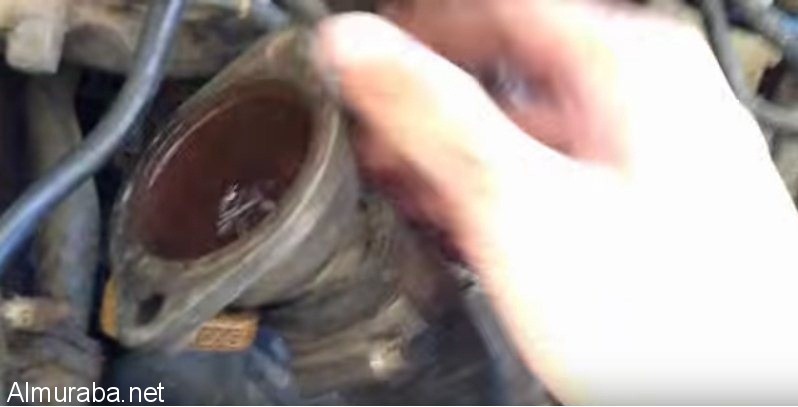 2- ضع قطعة من البلاستيك او مفرش من البلاستيك أسفل الكوع الذي يوجد داخله بلف الحرارة حتى لا تتسرب المياه الى أجزاء السيارة عند فك الكوع , ثم بإستخدام مفتاح مخصص لفك المساميراو الصواميل قم بفك مسماري الكوع اللذان يثبتانه بالمحرك .