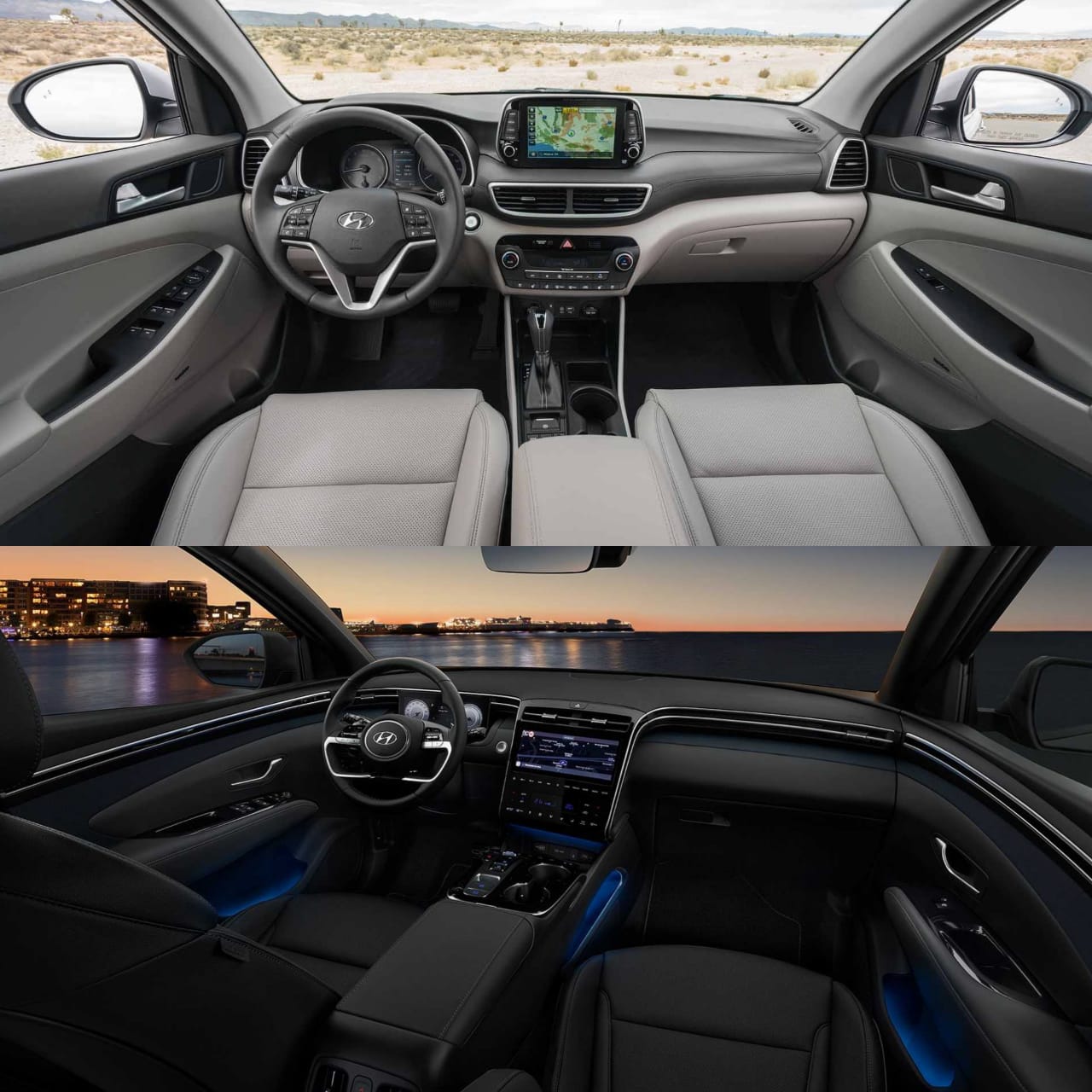 وأصبحت تتواجد بها في الشكل الجديد توسان 2021 بإضاءة محيطية بألوان عديدة، وأصبح ناقل الحركة كهربائي على هيئة أزرار، مع وجود شاشة جديدة كلياً بقياس 12 بوصة تقريباً، مع شاشة كبيرة للتحكم بالتكييف ثنائي المناطق، وأصبحت العدادات بشاشة ديجيتال بقياس 12 بوصة هي الآخرى.