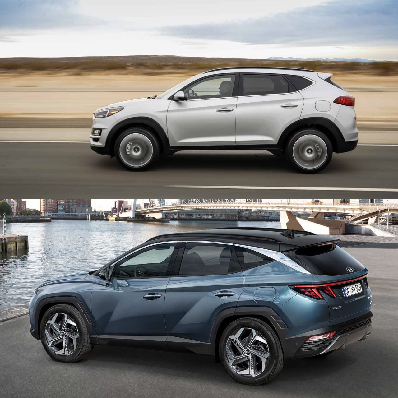 ومن الجانب، فتم تغيير الهيكل بالكامل من الأساس، فجاءت هيونداي توسان 2021 الشكل الجديد بخطوط انسيابية متنوعة على شكل مثلثات، بخلاف الشكل القديم الذي يوجد فيه فقط خطين، واحد من الرفارف الأمامية إلى المصابيح الخلفية، والآخر في العتب.