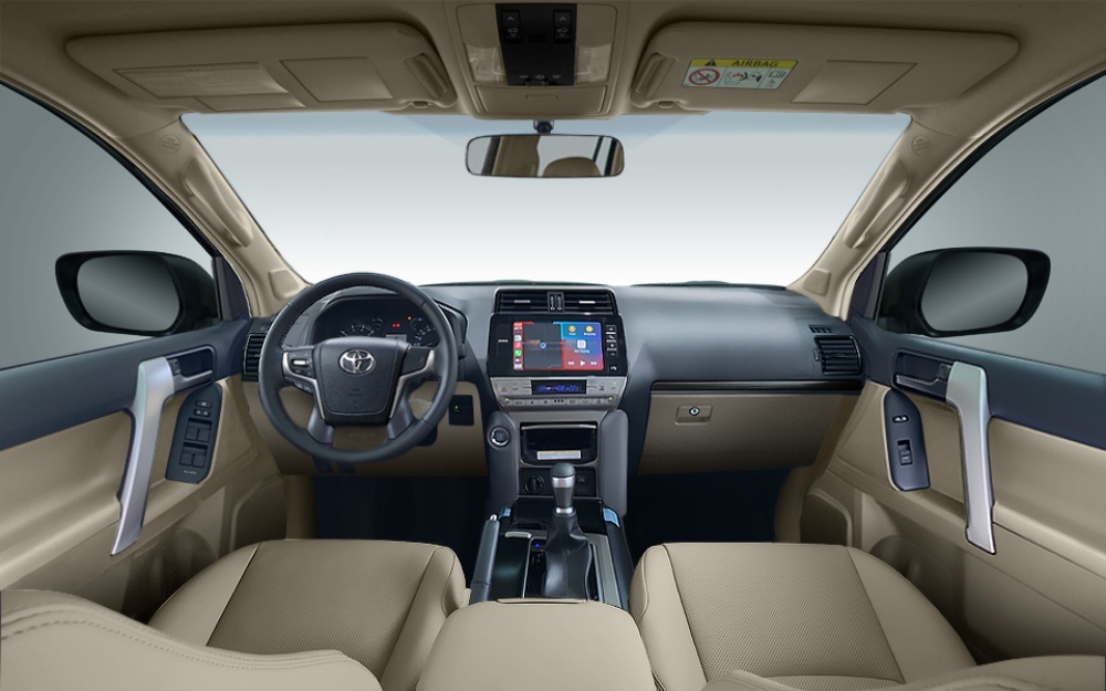 مقصورة فاخرة: تحتوي مقصورة برادو 2023، على الكثير من التجهيزات منها تشغيل وإدارة المحرك بدون مفتاح من خلال الزر، بالإضافة إلى ذلك شاشة المعلومات والترفيه اللمسية مقاس 9 بوصة وتدعم أنظمة آبل كار بلاي وأندرويد أوتو، مع نظام صوتي مكون من 6 سماعات، ومنافذ USB أمامية وخلفية، مع قاعدة الشحن اللاسلكي للهاتف الذكي.