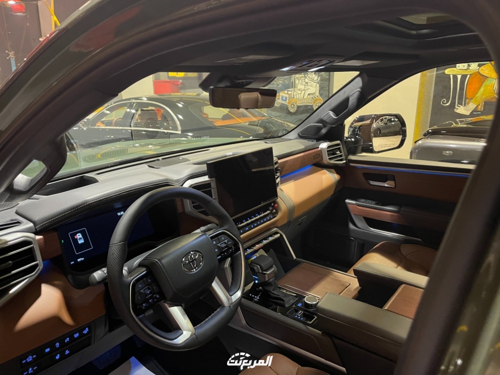 تتميز مقصورة تويوتا تندرا بباقة مميزة من التجهيزات والتقنيات الحديثة، فضلًا عن المساحات الواسعة التي تتمتع بها داخلية السيارة، تأتي بمقاعد من الجلد الفاخر تدعم التبريد والتدفئة، بالإضافة إلى شاشة وسائط تعمل باللمس مقاس 13.1 بوصة، مع خاصية دعم أبل كار بلاي واندرويد أوتو، وشاشة عدادات مقاس 8 بوصة، مع مكيف هواء أوتوماتيكي منفصل في المقاعد الخلفية، ولوحة شحن لاسلكية، وفتحة سقف بانورامية.