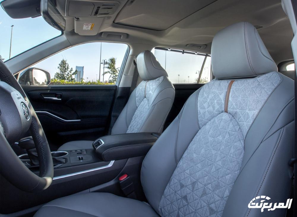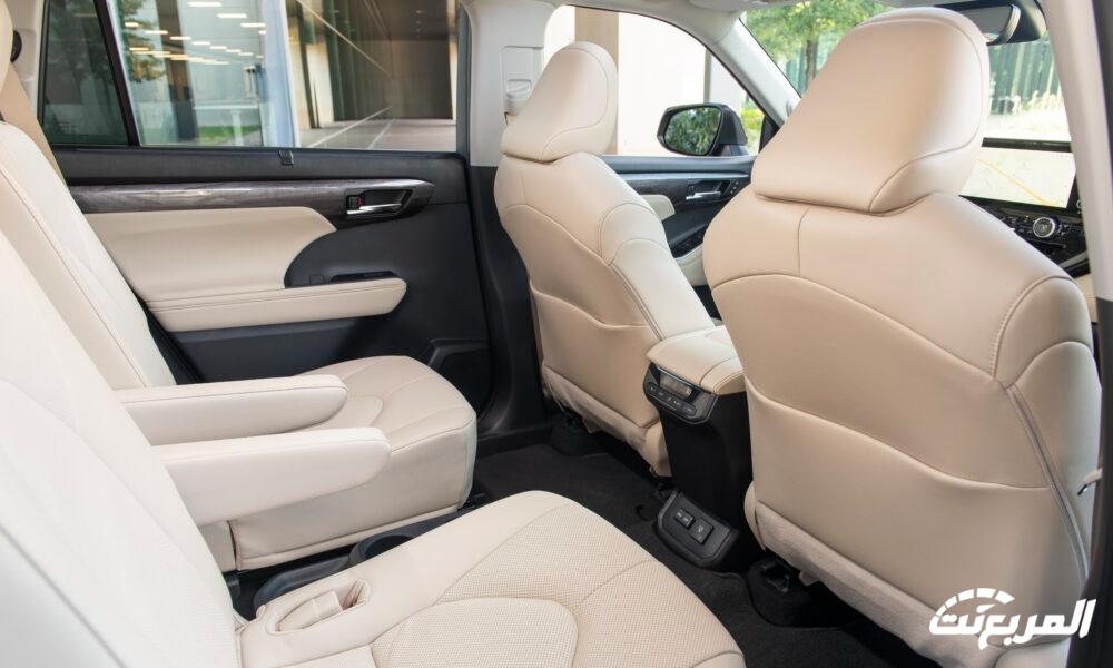 وبالحديث عن سيارة تويوتا هايلاندر؛ نجد أنها تتمتع بمقصورة ذات مساحات رحبة مكونة من ثلاثة صفوف و7 مقاعد من الجلد، تأتي المقاعد الأمامية بتحكم كهربائي في 8 اتجاهات، مع مسند ظهر لمقعد السائق، وذاكرة مع دعم خاصية التهوية والتدفئة لمقاعد الصف الأمامي والخلفي، بالإضافة إلى مقود قيادة متعدد الوظائف بكسوة من الجلد، ومرأة رؤية خلفية ذاتية التعتيم، مع ستائر لنوافذ الصف الثاني، وإضاءة داخلية محيطية باللون الأزرق، وتطعيمات خشبية، وعتبة معدنية لأبواب الأمامية.