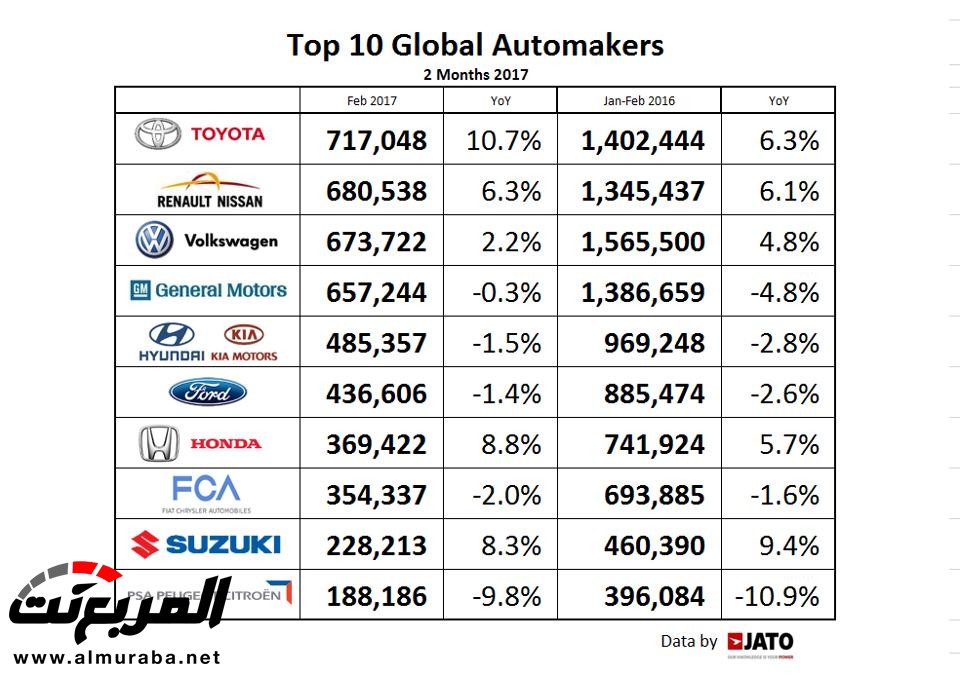 تويوتا احتلت المركز الأول في قائمة فبراير، بفضل نمو المبيعات في اليابان، ولكن مبيعات الإس يو في لتويوتا انخفضت في الولايات المتحدة، بينما قفز اتحاد رينو-نيسان للمركز الثاني عالميا بفضل إضافة ميتسوبيشي لمجموعتهم، وبفضل نتائج نيسان القوية في الولايات المتحدة والصين.