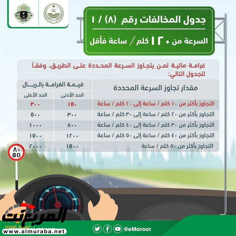 كم قيمة جدول مخالفات السرعة 80 في السعودية؟
