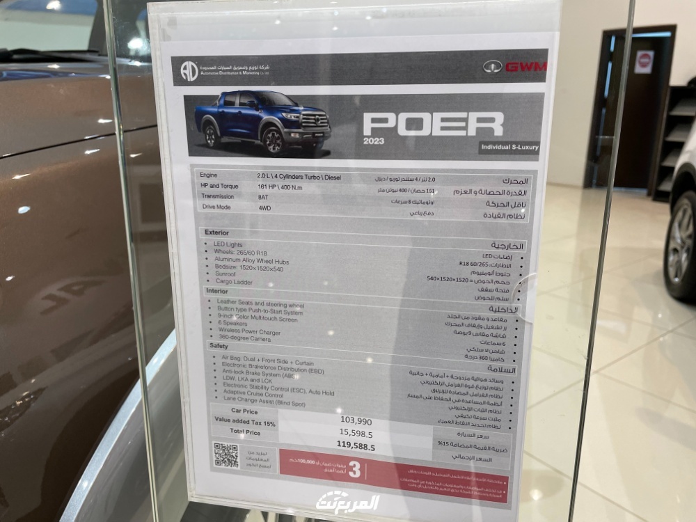 تتوفر سيارة البيك أب جريت وول باور موديل 2023، داخل السوق السعودي لدى وكيلها شركة توزيع وتسويق السيارات المحدودة، بسعر يصل إلى 119,588 ريال سعودي شامل قيمة الضريبة المضافة.
