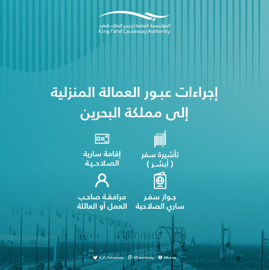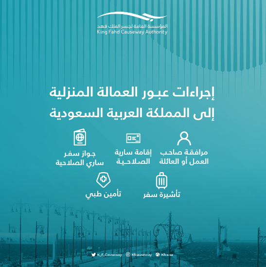 المربع نت – أعلن الحساب الرسمي للمؤسسة العامة لجسر الملك فهد، عن الإجراءات اللازمة لعبور العمالة المنزلية عبر جسر الملك فهد للمتجهين إلى مملكة البحرين والقادمين إلى المملكة العربية السعودية.