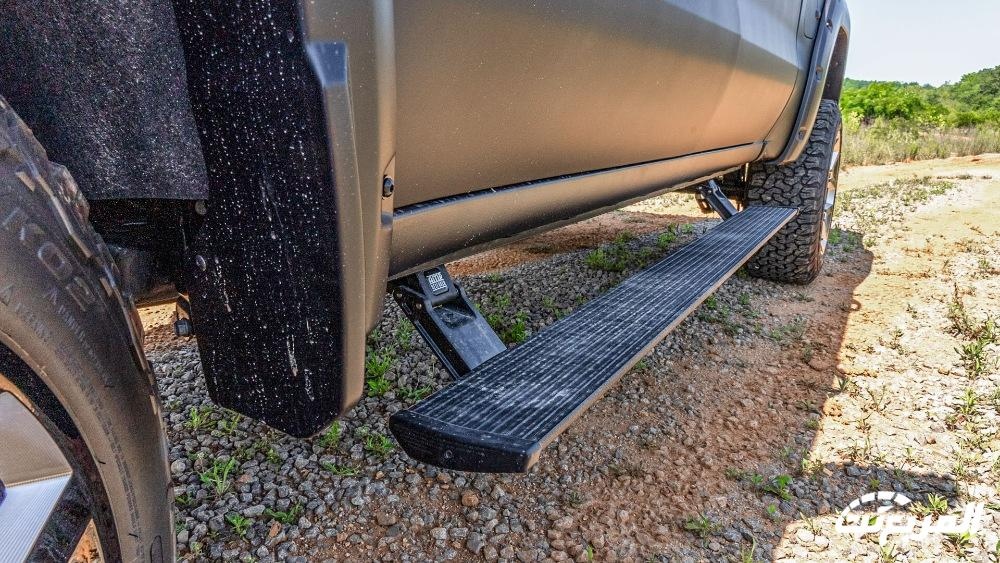 ومن الجانب، نجد رفارف جانبية معدلة بنفس لون السيارة، وعتبات جانبية عاملة بالكهرباء، وترتكز على جنوط عجلات من نوع A/T مقاس 33 بوصة، وفي الخلف نجد نظام عادم مخصص للأداء الرياضي بفتحتين باللون الأسود المطعم باللون البرتقالي مع زوائد من الألومنيوم باللون البرتقالي، ويأتي غطاء الصندوق الخلفي مغطى بشعار هارلي ديفدسون بحجم عملاق، مع كلادينج للصندوق الخلفي مع طرق فتح متعددة ومختلفة.