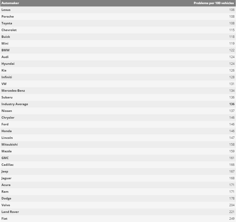 تظهر لنا الدراسة ظهور 141 مشكلة لكل 100 سيارة فاخرة، في حين واجهت السيارات التقليدية 135 مشكلة فقط، حيث عقدت هذه الدراسة بين شهري أكتوبر وديسمبر 2018 بناء على ردود 32,952 من الملاك الأصليين لسيارات موديل 2016.