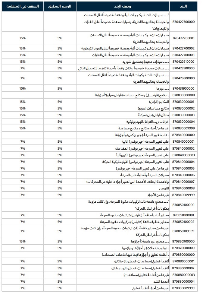 واتضح بأن القائمة تشملها السيارات كما هو موضح بالجداول أدناه بحيث ترتفع من 5% إلى 7%، وكذلك أجزاء السيارات بحيث ترتفع من 5% إلى 7% أو 15% بما يشمله ناقل المحركة والفرامل وغيره.