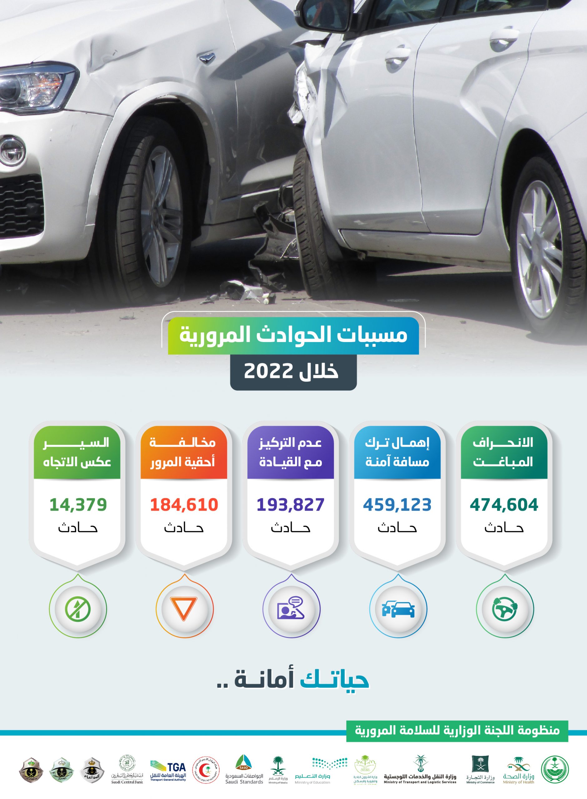 كشفت منصة “سلامتك” من خلال (فيديوجراف) نشرته عبر منصة “إكس”، عن أبرز الأسباب التي تؤدي لوقوع الحوادث المرورية على طرق المملكة، لافتةً إلى أن السبب الأول للحوادث يعود إلى الانحراف المفاجئ، وفيما يلي نستعرض لكم أبرز أسباب وقوع الحوادث والإحصائيات الناتجة عنها خلال عام 2022.