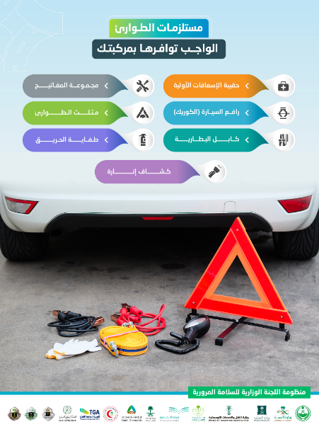 المربع نت – كشفت مبادرة “سلامتك” التابعة للجنة الوزارية للسلامة المرورية، والمتخصصة في تعزيز العمل التوعوي، عبر الحساب الرسمي على تويتر، عن مستلزمات الطوارئ التي يجب أن تتوافر في سيارتك، لضمان السلامة أثناء القيادة على الطرق.
