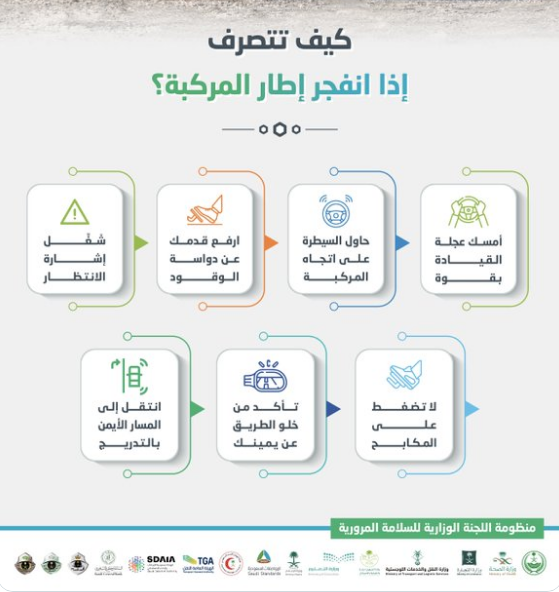 وكما ذكرنا فإن انفجار الإطار المفاجئ من أخطر المواقف التي قد يواجها قائدي المركبات، والذي ينتج غالبًا لأهمال فحص وصيانة الإطارات، ونظرًا لخطورة هذه المشكلة كشف الحساب الرسمي لمبادرة “سلامتك” عن كيفية التصرف الصحيح حال انفجار أحد الإطارات أثناء القيادة لتفادي وقوع الحوادث المرورية.