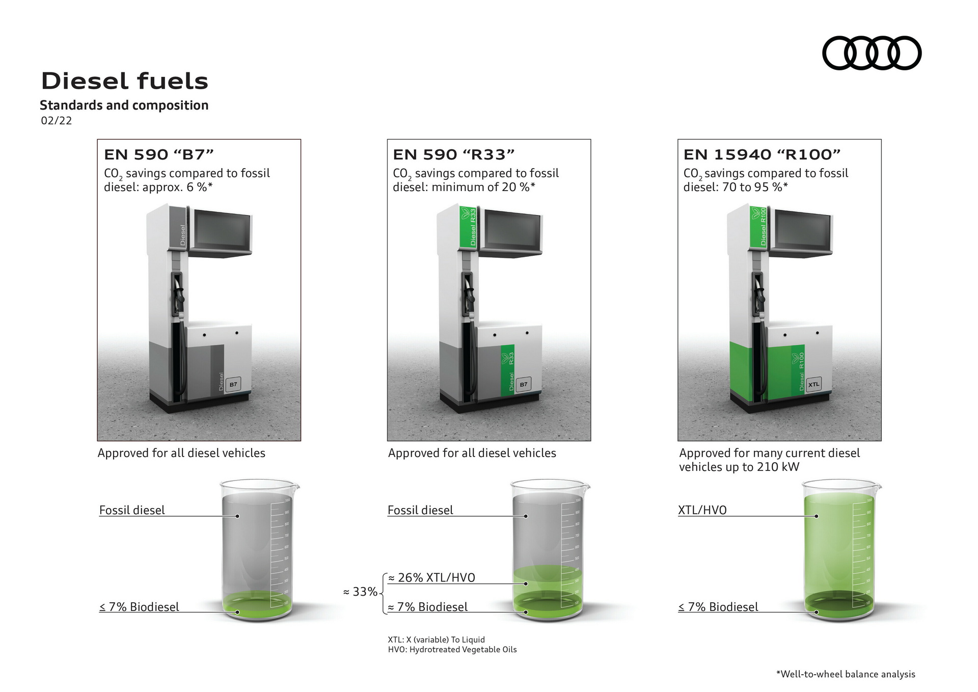 في هذا الاتجاه، أعلنت أودي إن جميع محركات الديزل 6 سلندر المولدة لـ 286 حصان والمصنعة بعد فبراير 2022 ستدعم الزيوت النباتية المهدرجة، والموصوفة بـ “المعيار الذهبي لوقود الديزل الحيوي”.