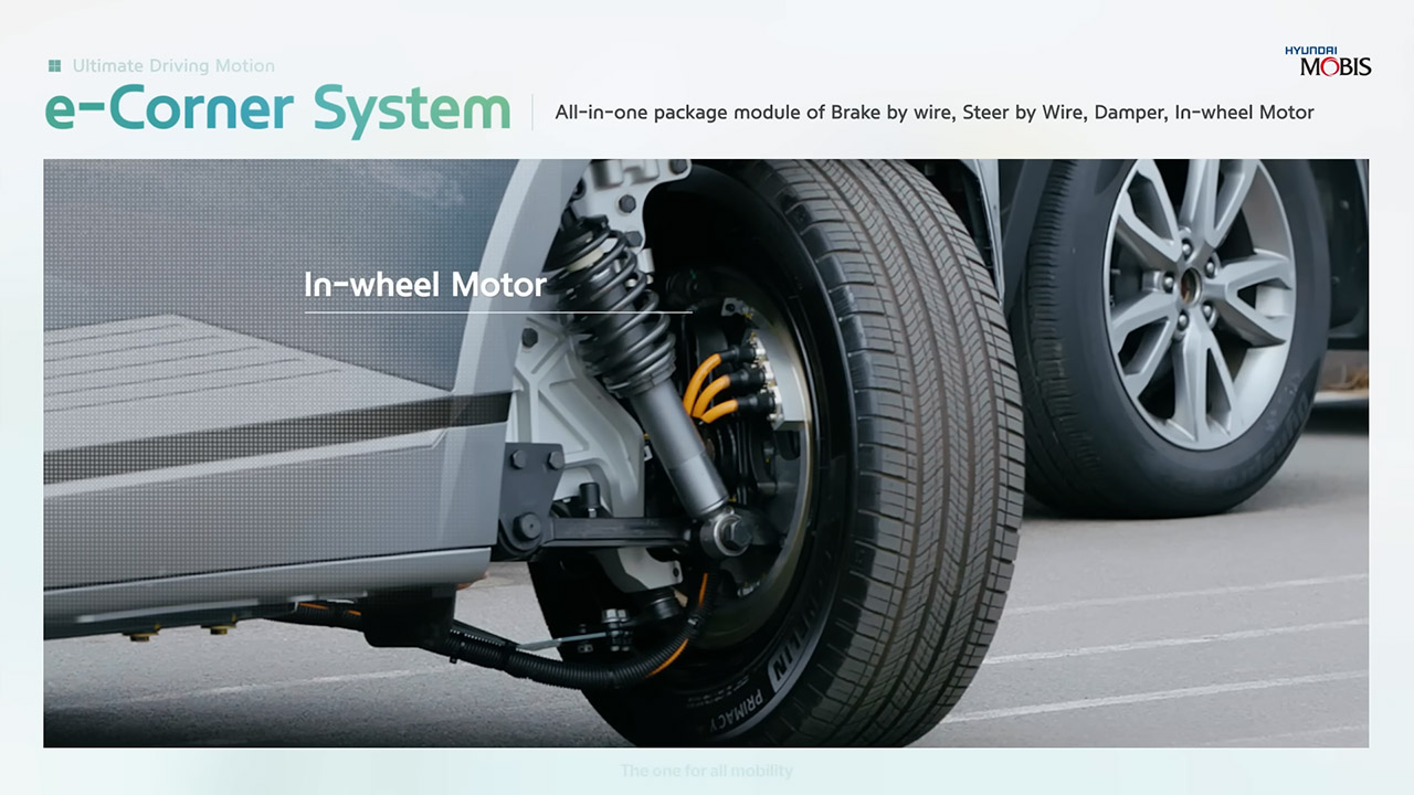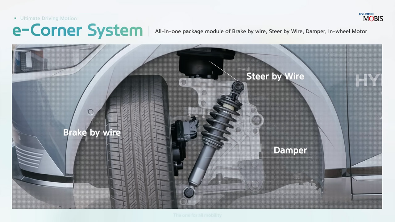 يستخدم نظام e-Corner الذي تم الكشف عنه على سيارة هيونداي ايونيك 5 محركات مستقلة داخل العجلات بجانب أنظمة الفرامل والتوجيه التقليدية لتحقيق الحركة المثالية، ولم تكشف الشركة عن احتمالية تطبيق هذا النظام في السيارات الإنتاجية على نطاق كبير بعد.