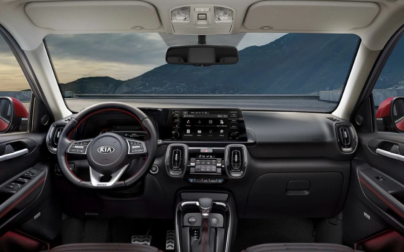 يتضح عند الدخول إلى السيارة وجود شاشة لعرض النظام الترفيهي وهي بمقاس 8 بوصة، أما العدادات فهي شاشة ملونة بشكل كامل وبمقاس 4.2 بوصة، وهناك مكيف هواء أوتوماتيكي ومن المُلاحظ أيضاً أن حواف الأبواب مصنوعة من الجلد مع زخارف حمراء في كيا سونيت 2022.