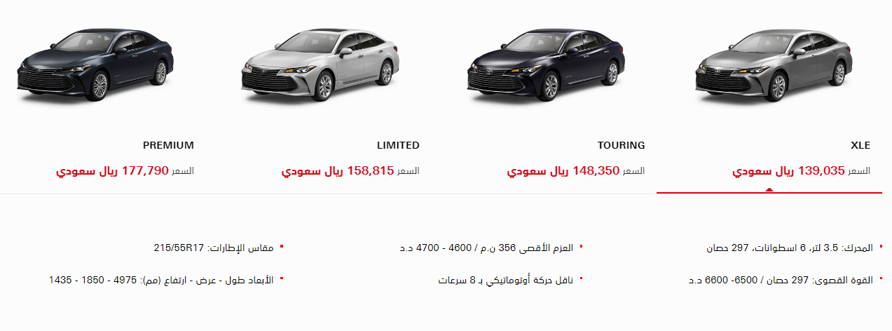 أفالونتتوفر بتسميات خاصة وبالترتيب: XLE ثم تورينج ثم ليمتد ثم بريميوم.