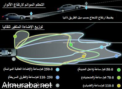 – يتغير الضوء من النور العالي للمنخفض بشكل تلقائي حسب حالة الطريق من أمطار, ضباب, وجود سيارة في الاتجاه المقابل…. الخ.