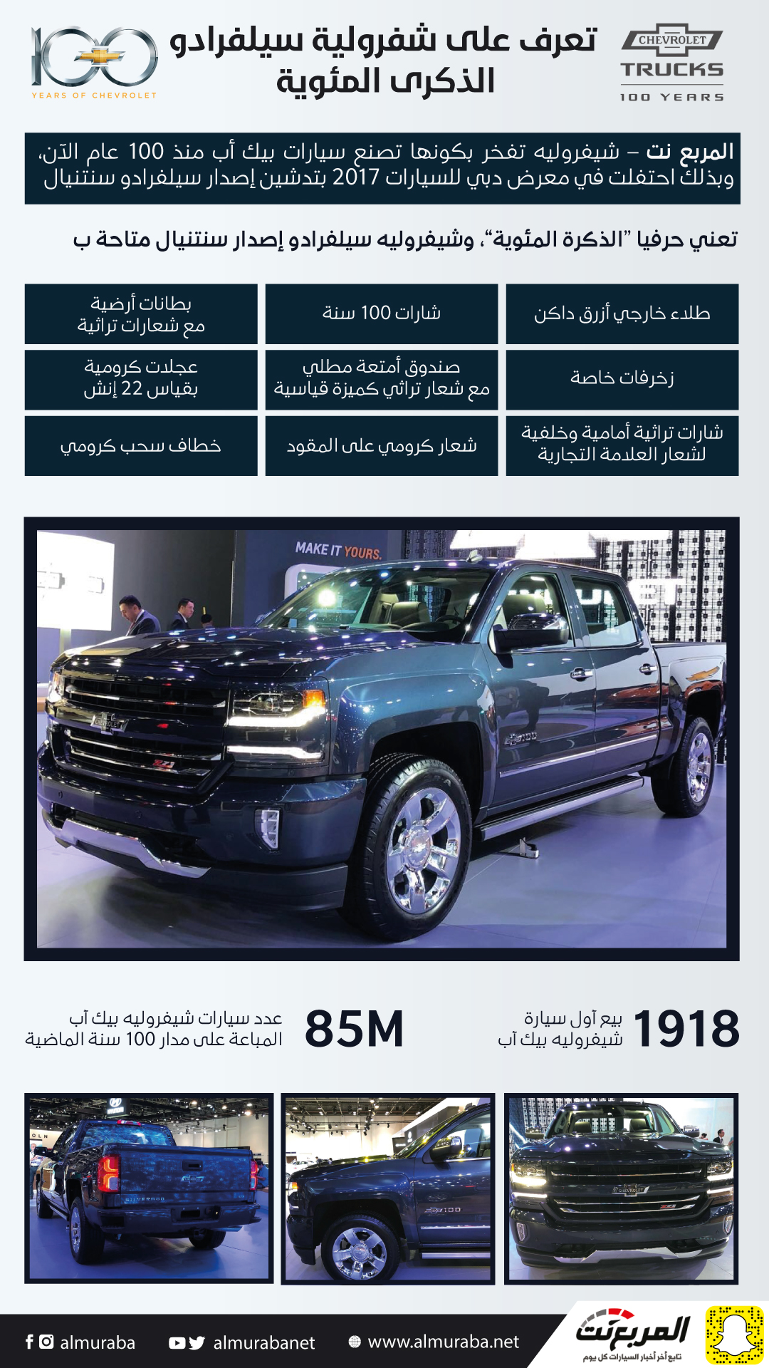 المربع نت – شيفروليه تفخر بكونها تصنع سيارات بيك أب منذ 100 عام الآن، وبذلك احتفلت في معرض دبي للسيارات 2017 بتدشين إصدار سيلفرادو سنتنيال.