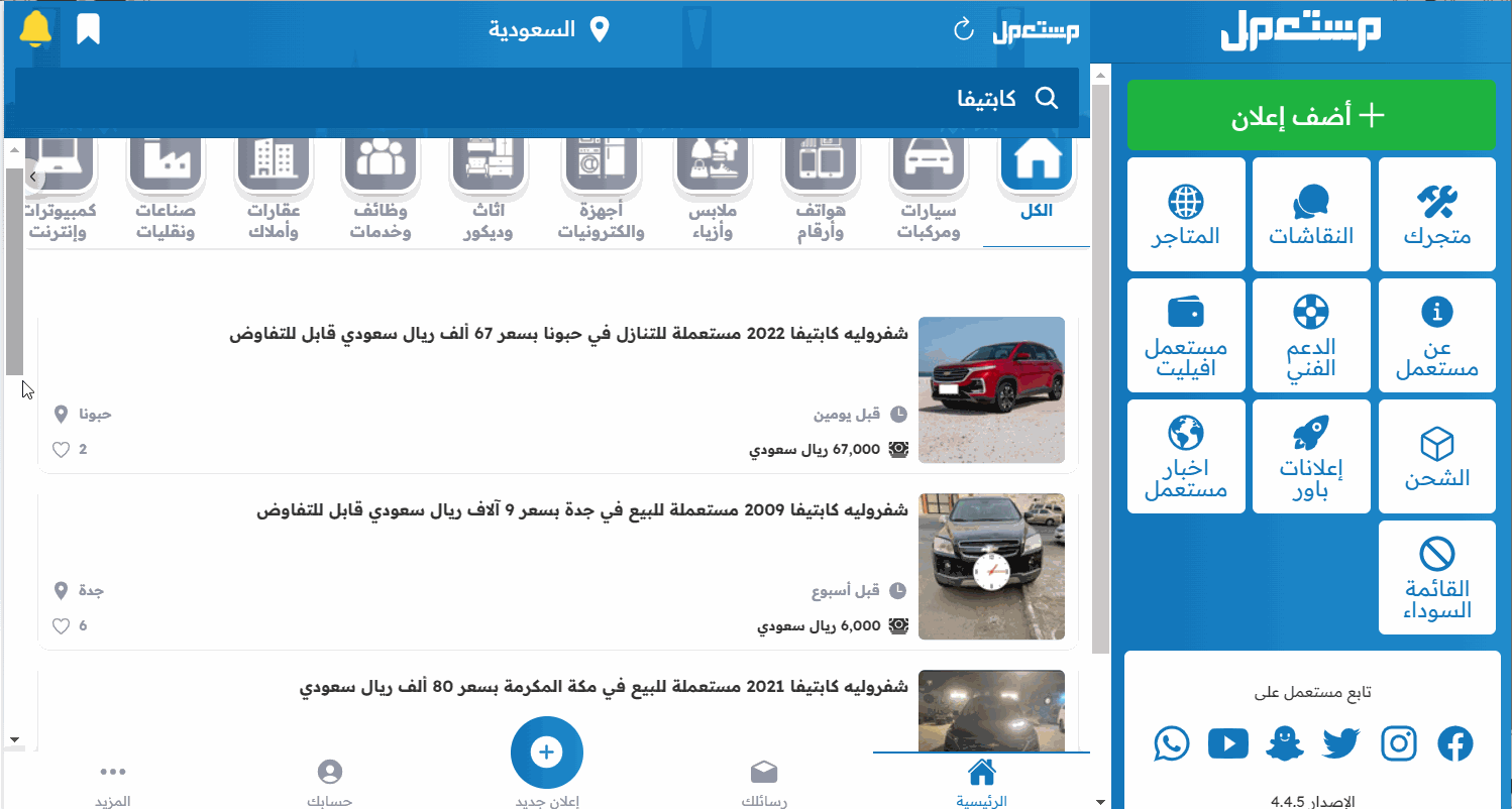 ومن أجل إتمام عملية شراء سيارة شيفروليه كابتيفا 2021 مستعملة في السعودية والتفـاوض مع مالكها، فإن الأمر يتطلب منك تَحميـل تطبيق مستعمل وجديد أولاً، أو الدّخول مُبـاشرة إلى المـوقـع الـرّسمي من هُنــا.