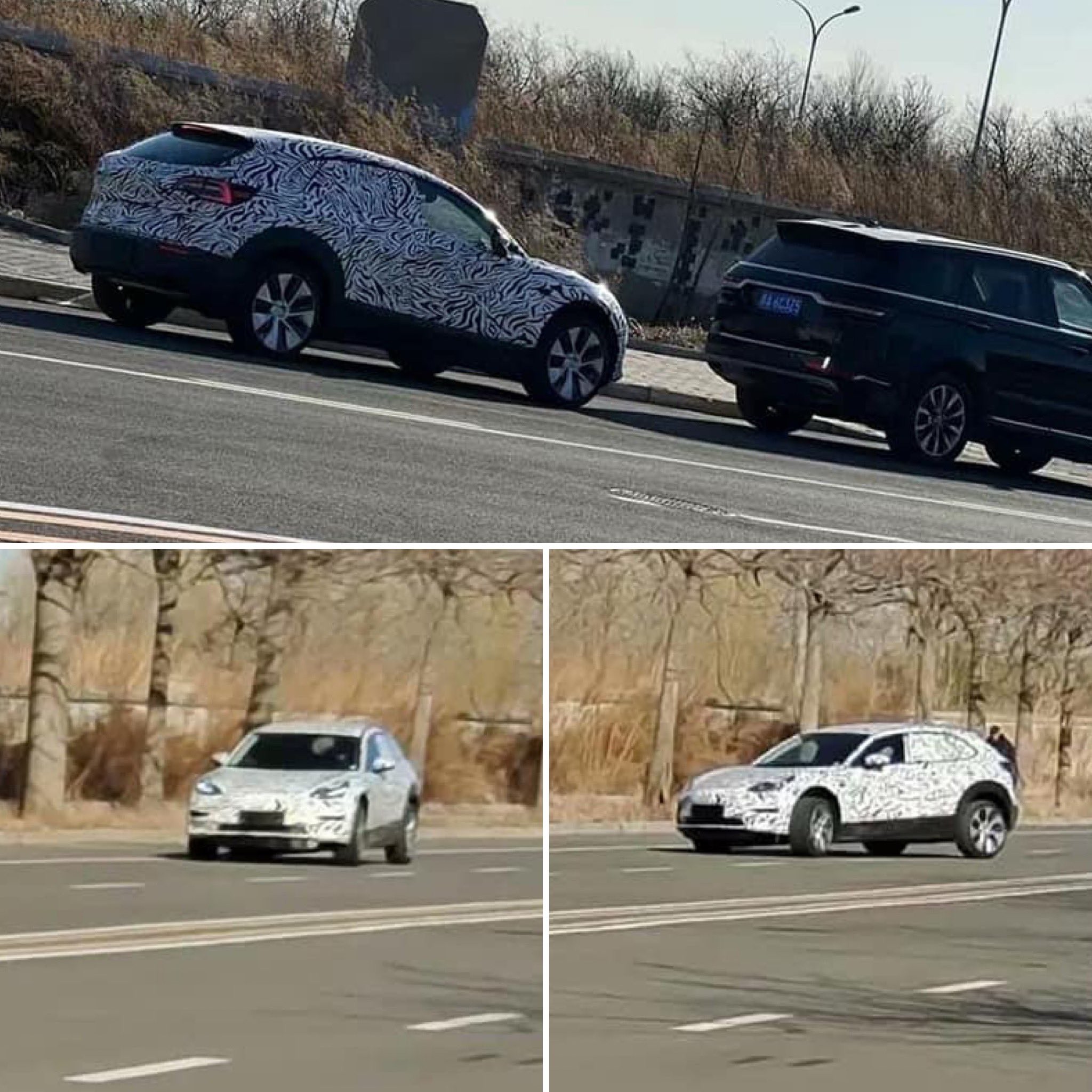نشاهد في الصورة التجسسية الهيكل الخاص بمازدا CX-30 كروس أوفر، ولكن بمقدمة تيسلا موديل 3 حيث نشاهد المصد الأمامي وغطاء المحرك مع المصابيح وأقواس العجلات الأمامية أيضاً من سيارة تيسلا، وعلى جانبي السيارة نشاهد التصميم الأساسي لسيارة مازدا.