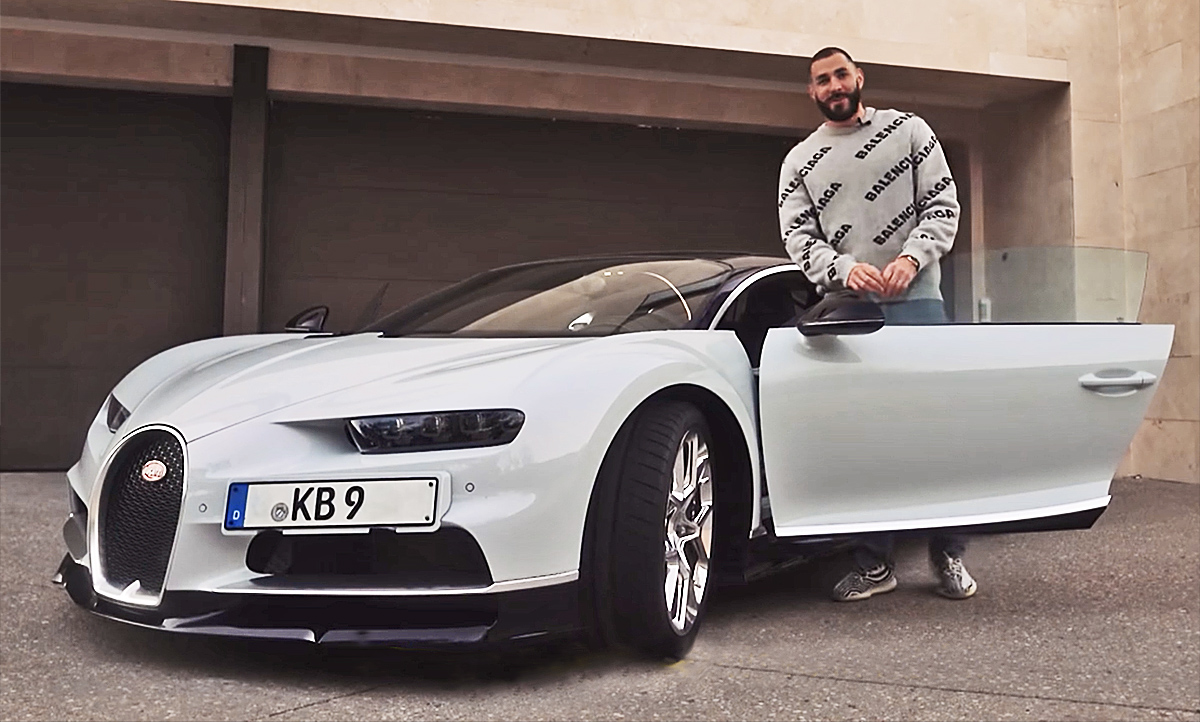 تسيطر السيارات الرياضية عالية الأداء على أسطول سيارات كريم بنزيما، فنجد أنه يمتلك الأيقونة الفرنسية الفريدة من نوعها بوجاتي شيرون ، والتي تبلغ قيمتها 2.5 مليون جنيه استرليني، وهي من السيارات المُحببة للاعبي كرة القدم في الدوريات الأوروبية بشكل عام.