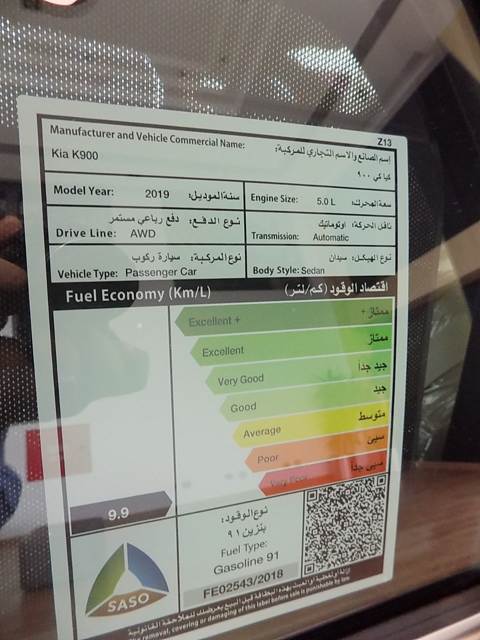 هذا وتأتي سيدان كيا K900 الكاملة الفاخرة بمحرك 3.8 لتر بمعدل استهلاك 11.1 كم/لتر.