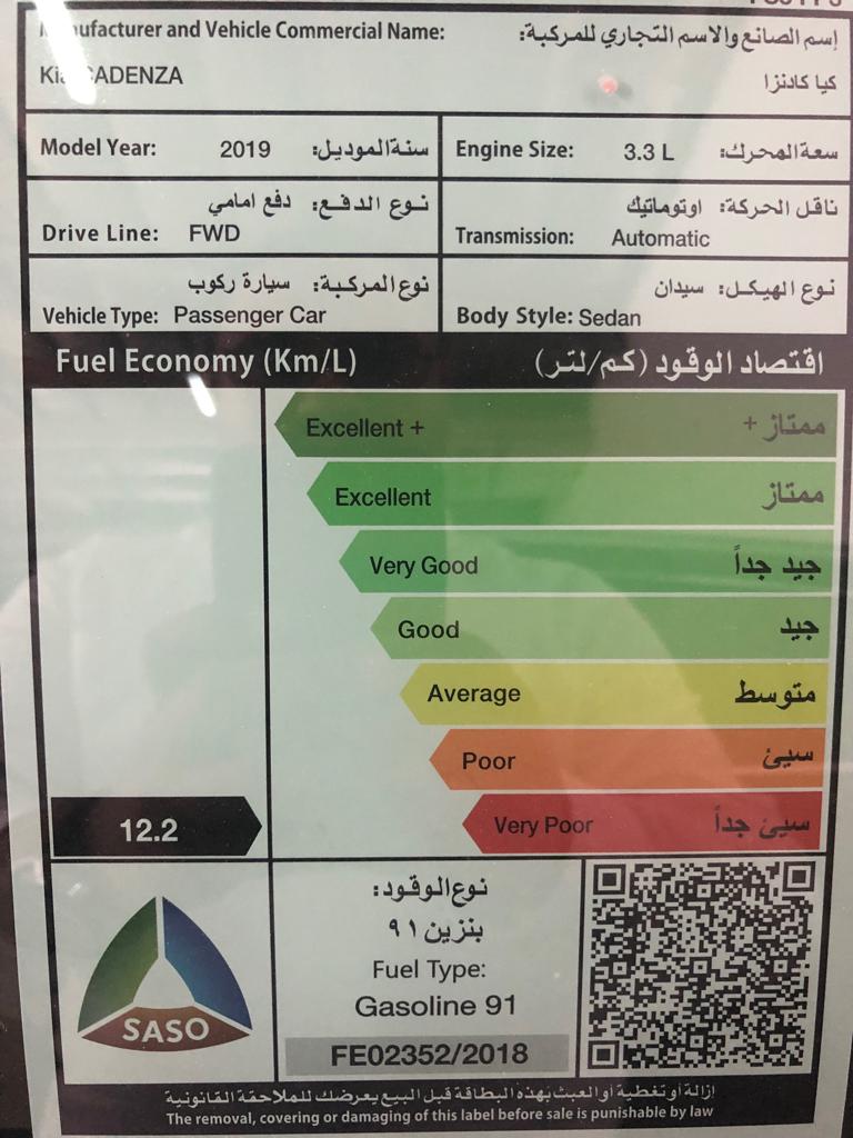 تأتي سيدان كيا كادينزا الكاملة أيضاً مع محرك 3.3 لتر بصرفية وقود 12.2 كم/لتر.