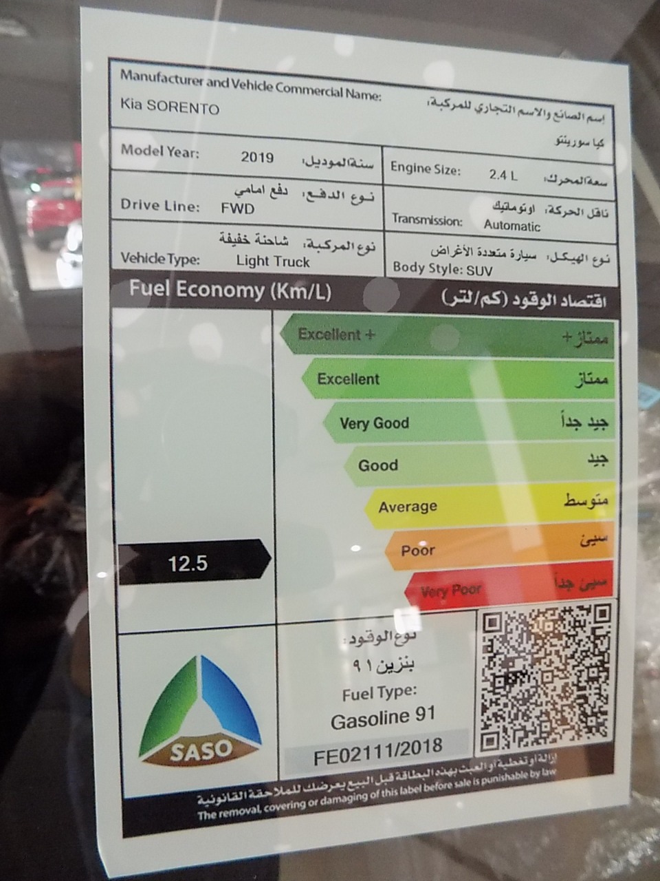 تتوفر SUV كيا سورينتو المتوسطة مع محرك 2.4 لتر بدفع أمامي ومعدل استهلاك 12.5 كم/لتر.
