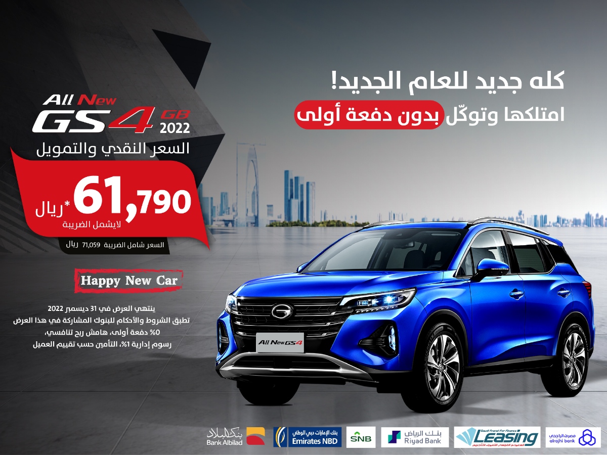 - احصل على سيارة gac gs4 gb 2022 نقدا أو تمويل مقابل 61,970 ريال سعودي بدون الضريبة