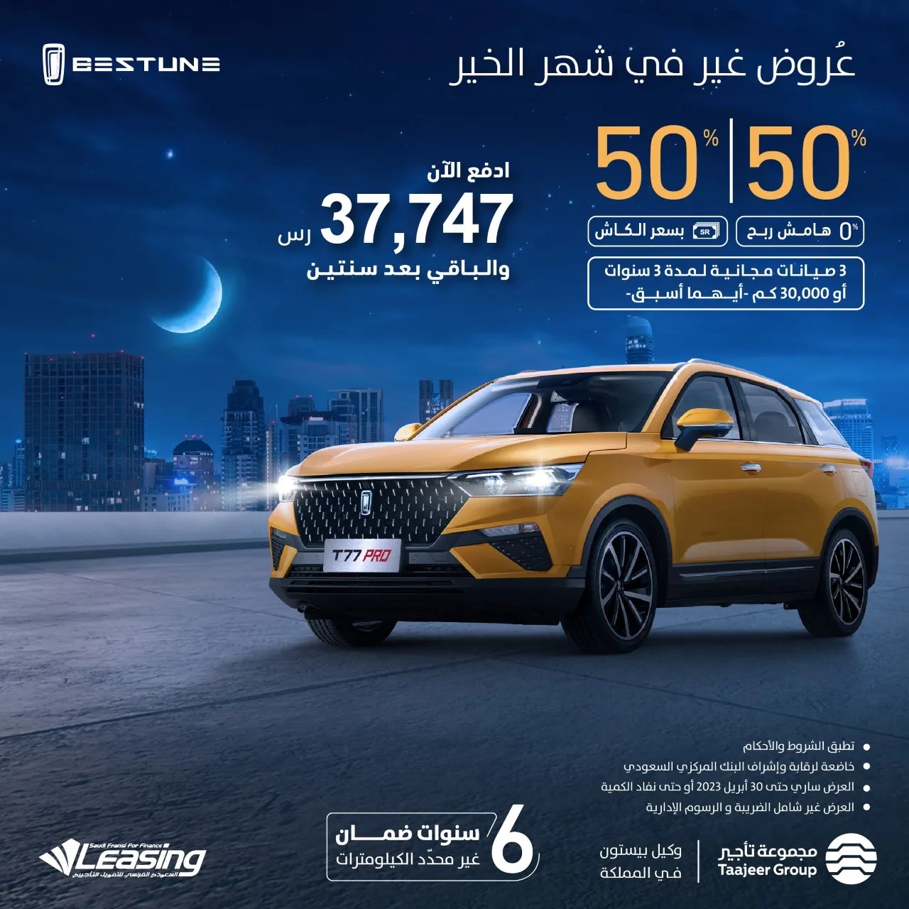 وأخيراً، شملت عروض السيارات 2023 المُقدمة من بيستون السعودية خلال شهر رمضان الكريم، عرض «3 أقساط علينا»، والذي شمل كل من : سيارة B70 2023، وT77 pro موديل 2023، وسيارة T99موديل 2023.