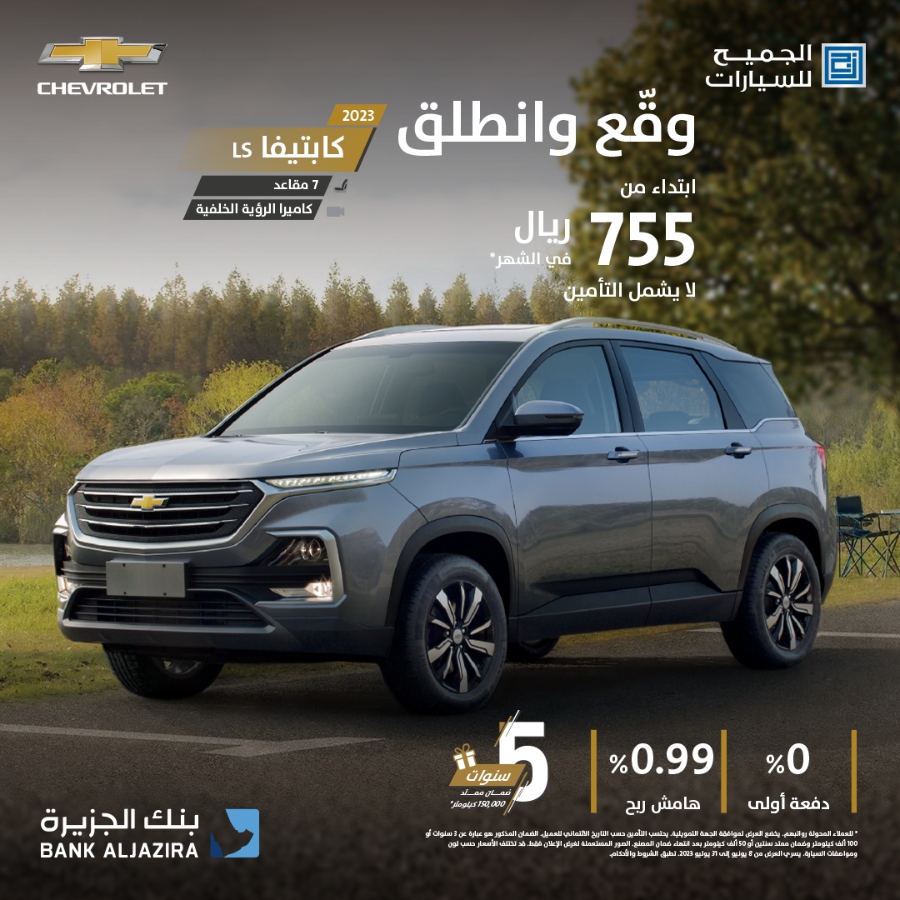 المربع نت : عروض السيارات – استفد من عروض شيفروليه المقدمة من الوكيل الرسمي شركة الجميح للسيارات على مجموعة من الطرازات المختارة ضمن عروض الصيف، وتعرف معنا على تفاصيل العروض على سيارة شيفروليه كابتيفا 2023.