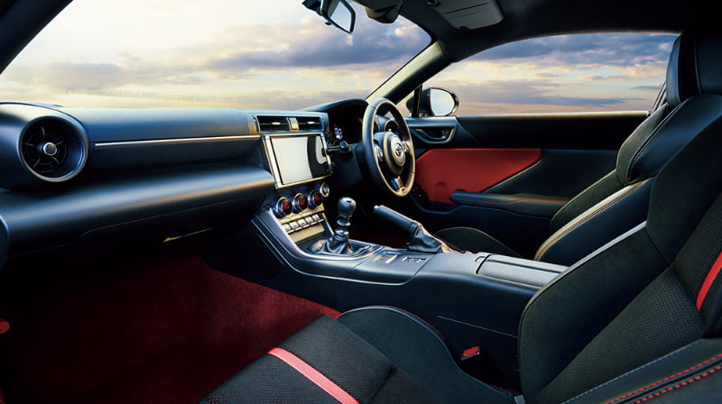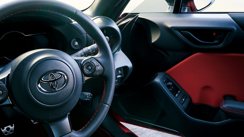 تكون المقاعد بتغطية من الجلد، وهذا ما يتحقق أيضاً بتطغية المقود من الجلد وهو مع أزرار للتحكم بالنظام الصوتي، وإذا كان الحديث بوجه الخاص عن فئات تويوتا GR86 2024 من حيث نظام الترفيه، فهناك شاشة عرض النظام الترفيهي ذات مقاس 8 بوصة.