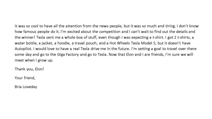 ما حدث بالضبط أنّ فتاة تُدعى بريا لافداي تبلغ من العمر 10 سنوات قامت بإرسال رسالة إلى إيلون ماسك الرئيس التنفيذي لتيسلا جعلت منها نجمة وفحواها إثناءٌ على أناقة سياراتهم وتسائلٌ عن سبب عدم تواجد إعلانات تجارية لهُم, ولذلك طلبت منهم أن يجروا منافسة مفتوحة للإعلانات التجارية بين الهواة.